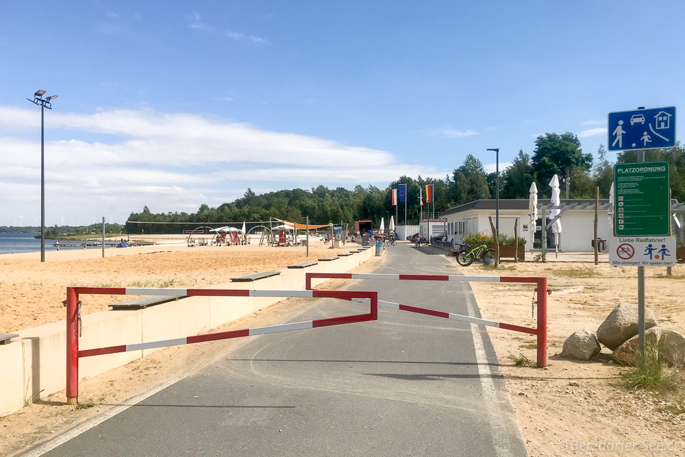 Zwolnijcie tempo podczas jazdy rowerem lub na rolkach do południowej plaży Blaue Lagune, Berzdorfer See.