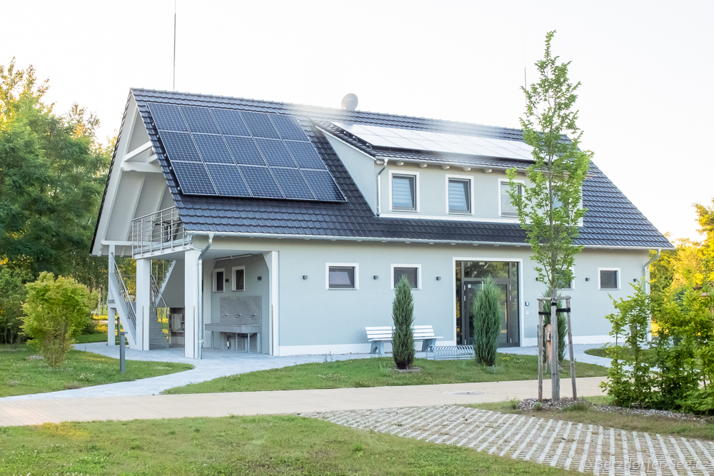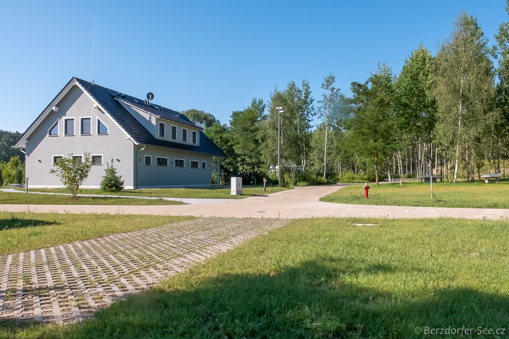 Budynek centralny, w którym znajdują się sanitariaty, prysznice, camping przy Berzdorfer See.