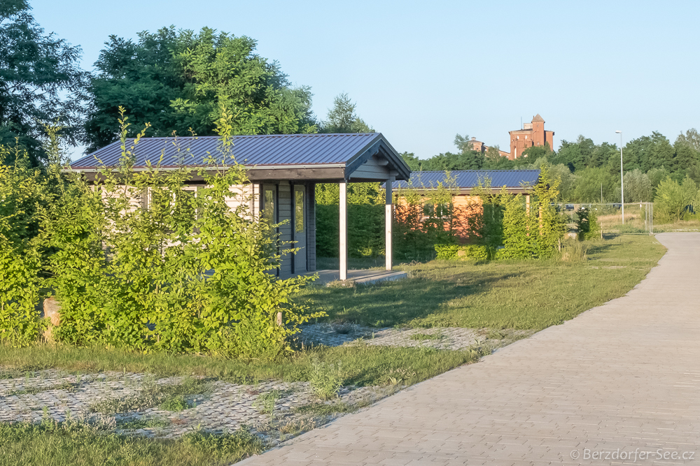 Budynek centralny z toaletami na kempingu Blue Lagoon w pobliżu jeziora Berzdorf.