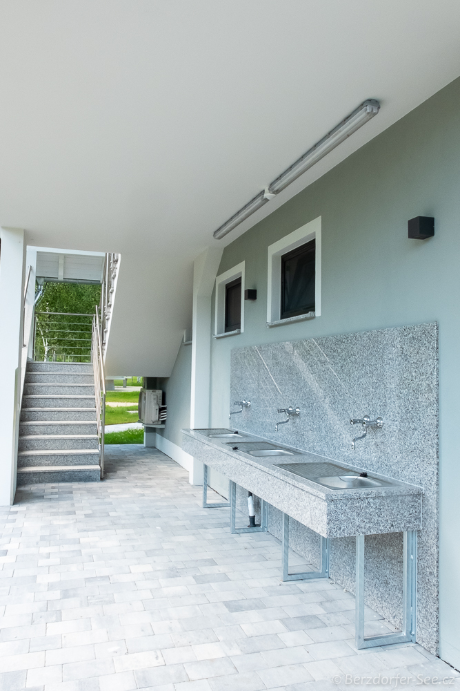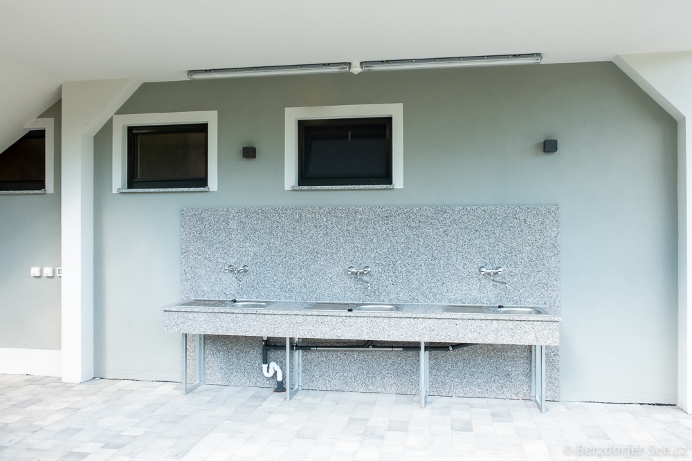 Zlewy do mycia naczyń w budynku głównym na kempingu przy plaży Blue Lagoon – Berzdorfer See.